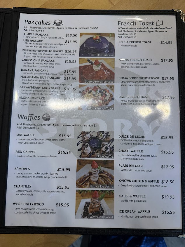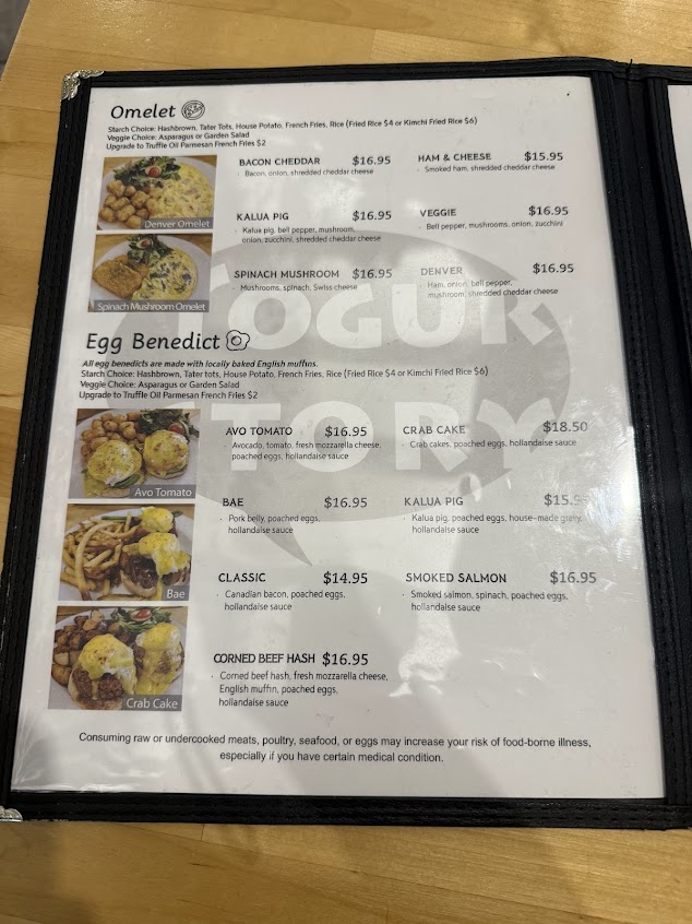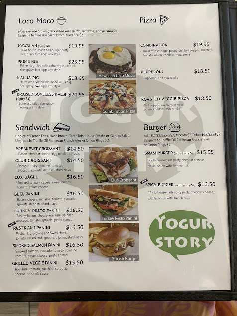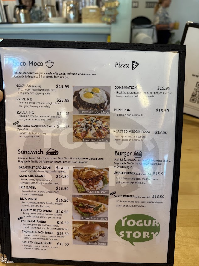 We came to Yogurstory on a Friday at 9:30am after my bf had recommended from years ago. It was quick with their wait list; joined 10 minutes before and only waited a few minutes. The parking lot was packed, but we found metered parking on the street. The restaurant has ample seating, so they're able to seat a lot at one time. We ordered the croissant sandwich with fries, short rib loco moco, crab cake benedict, pork belly benedict, and split the ube pancakes for the table. We've eaten at a lot of brunch and lunch around Honolulu, and Yogurstory was by far our favorite! A short rib benedict on the mainland would easily cost $30-40, so $25 and taking leftovers was incredible; AND the quality is unmatched. Service was attentive and friendly, and the food is well worth any wait. The pancakes are SO fluffy, and the short rib loco moco was our favorite - sooo tender. For 4 people, at around $20 per brunch entree, it is totally worth it. Amazing flavor, and we took home leftovers. CanNOT recommend Yogurstory enough - a must-go on any Honolulu stay.